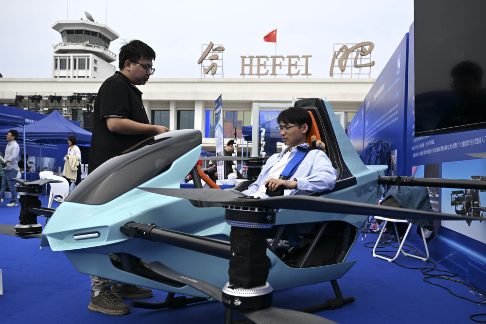 \n\t2025年9月21日,观众在2025世界制造业大会“全空间无人体系成果展”上体验由安徽猛狮航空科技有限公司展出的一款无人驾驶飞行摩托。新华社记者 黄博涵 摄